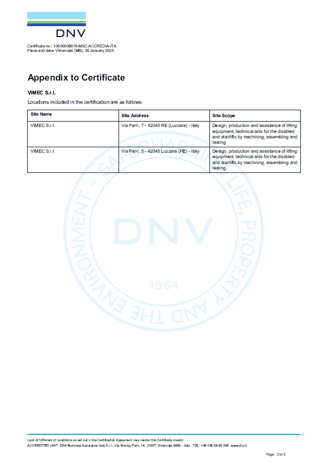 Wszystkie urządzenia Vimec są zgodne z wymogami Dyrektyw Europejskich, posiadają więc znak CE. W celu zapewnienia zgodności z przepisami Vimec uzyskał na wszystkie swoje produkty deklaracje zgodności wystawione przez Jednostki Notyfikacyjne (TUV i IMQ). Kolejnym potwierdzeniem wysokiej jakości produktów Vimec jest także fakt, że Vimec jako pierwsza włoska firma w branży uzyskała certyfikat UNI EN ISO 9001 i certyfikat Systemu Jakości DNV (Det Norske Veritas), odnowiony zgodnie z Vision 2000.